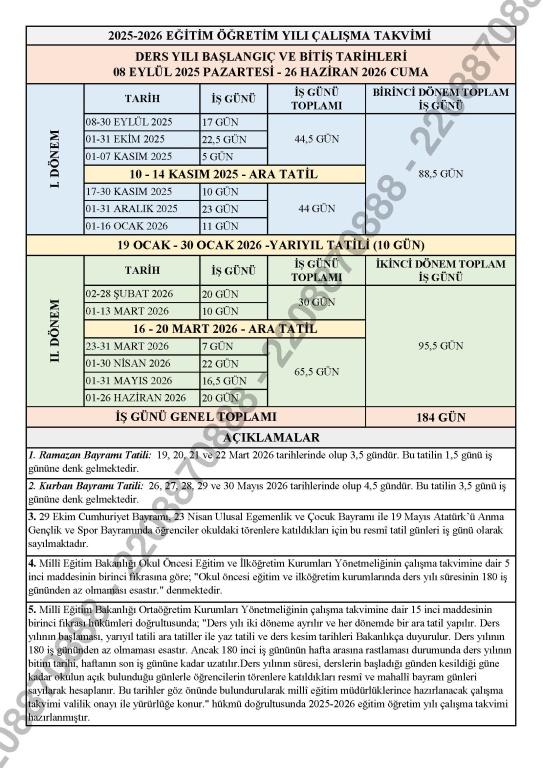 2025-2026 EĞİTİM VE ÖĞRETİM YILI ÇALIŞMA TAKVİMİ